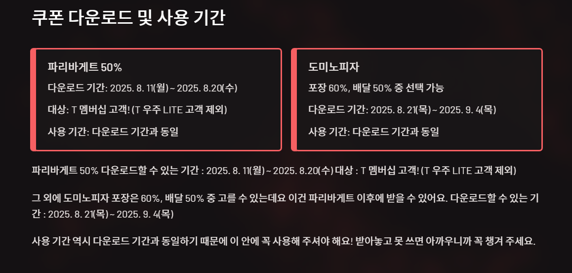 키워드: SKT 파리바게트 50% 쿠폰, 고객 감사 패키지, T 멤버십, 도미노피자 혜택