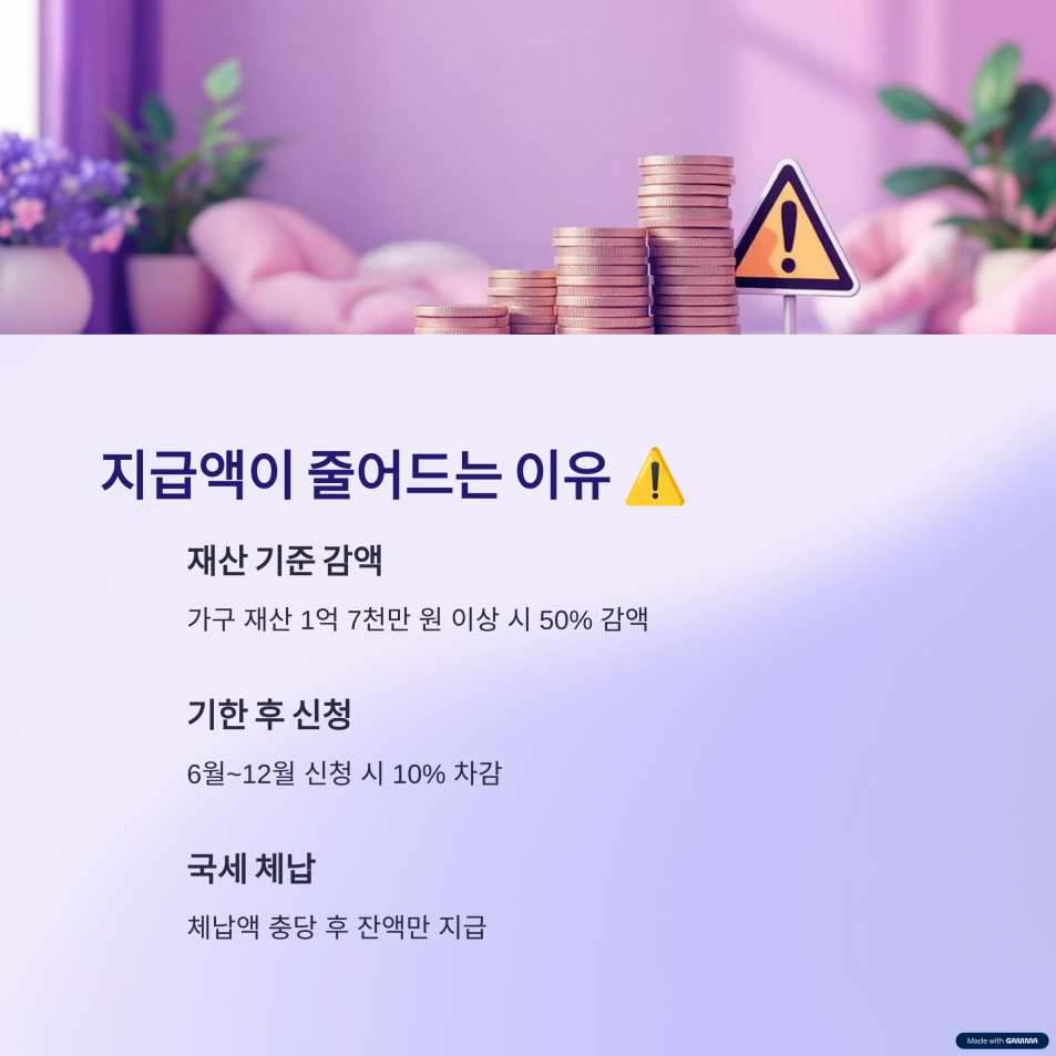 - 재산 기준 감액: 가구 재산이 1억 7천만 원 이상이면 50% 감액
