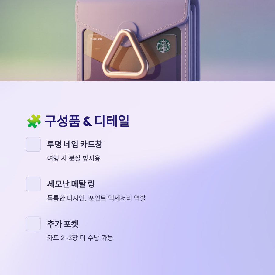 - 추가 포켓 : 앞쪽에는 카드 2~3장을 더 넣을 수 있는 포켓이 마련되어 있습니다.