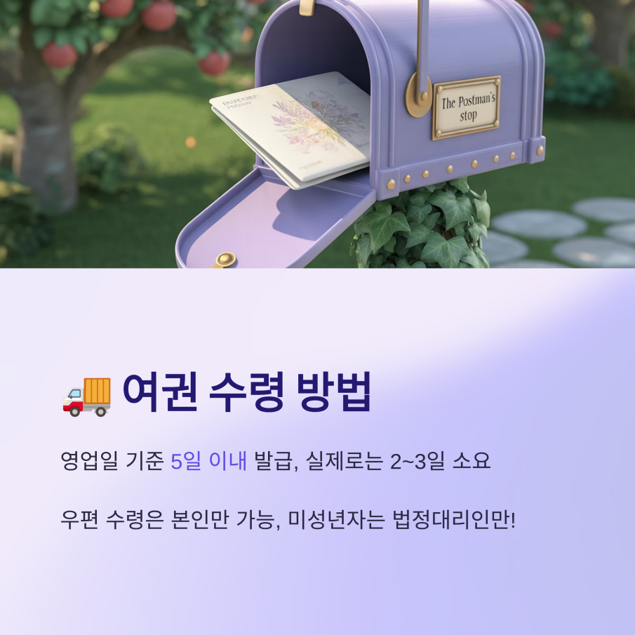 여권은 일반적으로 영업일 기준 5일 이내 발급됩니다. 하지만 실제로는 2~3일 만에 받을 수도 있어요. 저는 우편 수령을 선택했는데, 신청 후 이틀 만에 도착했습니다.