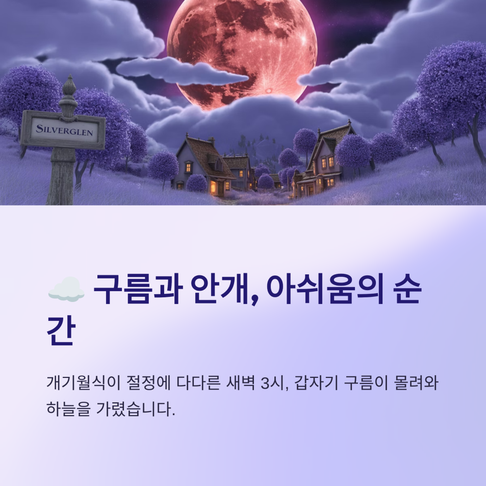 포기하려던 순간, 기적처럼 구름 사이로 붉은 달이 다시 고개를 내밀었습니다. 비록 선명하지는 않았지만, 흔들리는 손으로 겨우 몇 장의 사진을 남길 수 있었고, 그 순간은 제게 평생 잊지 못할 추억이 되었습니다.