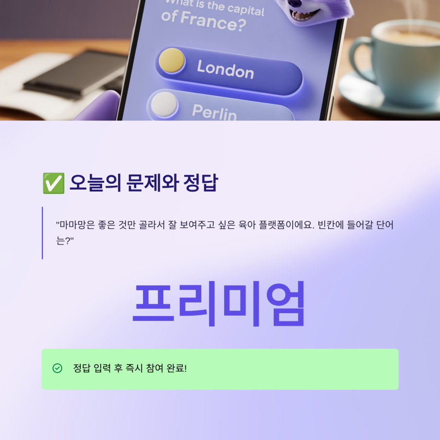 오늘의 정답 ‘프리미엄’을 입력해 참여를 완료하세요. 꾸준히 참여하는 것만으로도 매일 혜택을 누릴 수 있습니다.